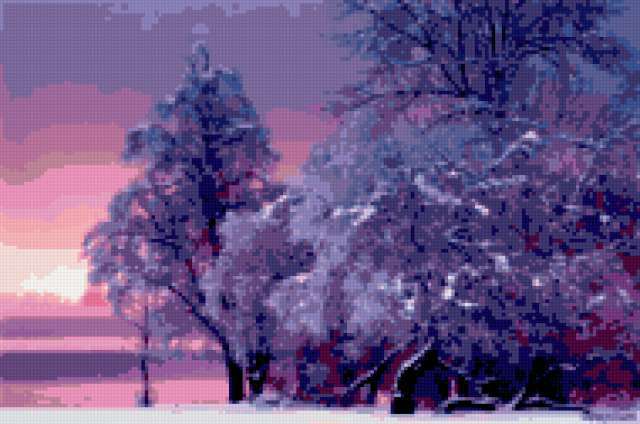 Ориентировочно так, схема вышивки «"Зима".Пейзаж.», созданная автором svobodna-7, будет выглядеть при отшиве на канве. Размер данной вышивки равен 190x126 крестов, при этом используется 33 цветов. Ключевые слова, по которым можно найти эту схему: зима, река, берег, мост, лес, деревья, снег, день, картина, пейзаж, акварель, вышивка, сложное, разное. Также, вы можете взглянуть на оригинальную картинку, соответствующую данной схеме вышивки.