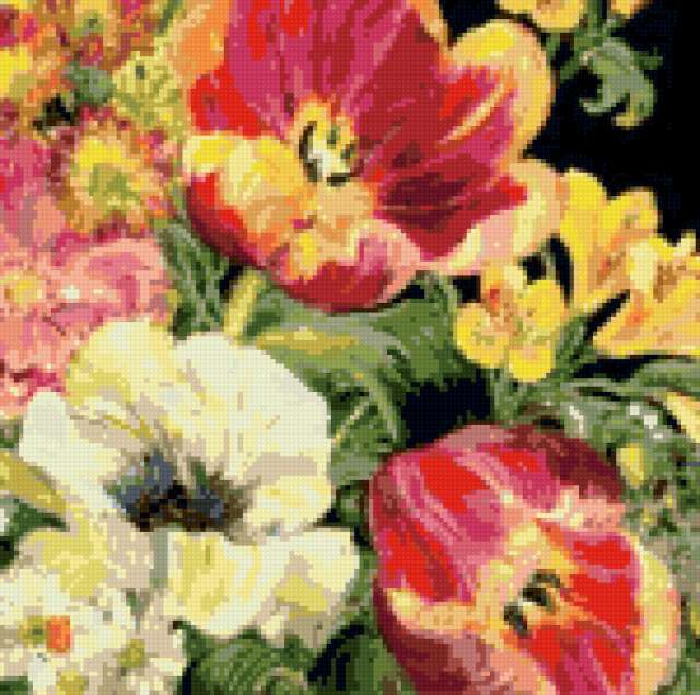 Ориентировочно так, схема вышивки «#137», созданная автором OLGABASH, будет выглядеть при отшиве на канве. Размер данной вышивки равен 150x149 крестов, при этом используется 46 цветов. Ключевые слова, по которым можно найти эту схему: подушка, цветы, листья. Также, вы можете взглянуть на оригинальную картинку, соответствующую данной схеме вышивки.