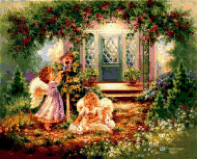 Ориентировочно так, схема вышивки «#142», созданная автором Svet-lana-OK, будет выглядеть при отшиве на канве. Размер данной вышивки равен 190x153 крестов, при этом используется 83 цветов. Ключевые слова, по которым можно найти эту схему: ангел, дети, разное, природа. Также, вы можете взглянуть на оригинальную картинку, соответствующую данной схеме вышивки.