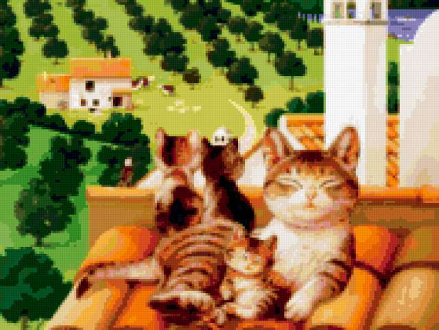 Ориентировочно так, схема вышивки «#424», созданная автором Svet-lana-OK, будет выглядеть при отшиве на канве. Размер данной вышивки равен 190x143 крестов, при этом используется 76 цветов. Ключевые слова, по которым можно найти эту схему: кошка, разное, животные, детям, звери. Также, вы можете взглянуть на оригинальную картинку, соответствующую данной схеме вышивки.