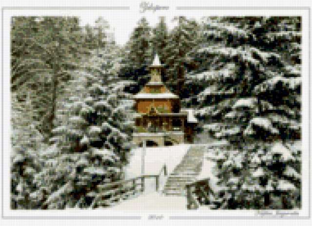 Ориентировочно так, схема вышивки «&1461», созданная автором Axlamonka, будет выглядеть при отшиве на канве. Размер данной вышивки равен 190x138 крестов, при этом используется 55 цветов. Ключевые слова, по которым можно найти эту схему: зима, природа, часовня. Также, вы можете взглянуть на оригинальную картинку, соответствующую данной схеме вышивки.