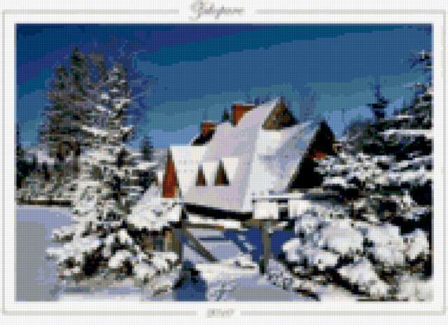 Ориентировочно так, схема вышивки «&1462», созданная автором Axlamonka, будет выглядеть при отшиве на канве. Размер данной вышивки равен 190x138 крестов, при этом используется 61 цветов. Ключевые слова, по которым можно найти эту схему: зима, деревенька, домик. Также, вы можете взглянуть на оригинальную картинку, соответствующую данной схеме вышивки.