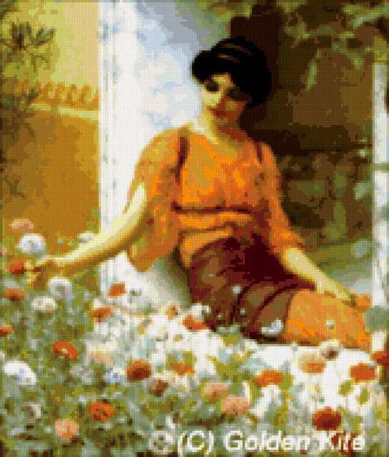 Ориентировочно так, схема вышивки «&1477», созданная автором Axlamonka, будет выглядеть при отшиве на канве. Размер данной вышивки равен 162x190 крестов, при этом используется 73 цветов. Ключевые слова, по которым можно найти эту схему: восток, девушка, сад. Также, вы можете взглянуть на оригинальную картинку, соответствующую данной схеме вышивки.