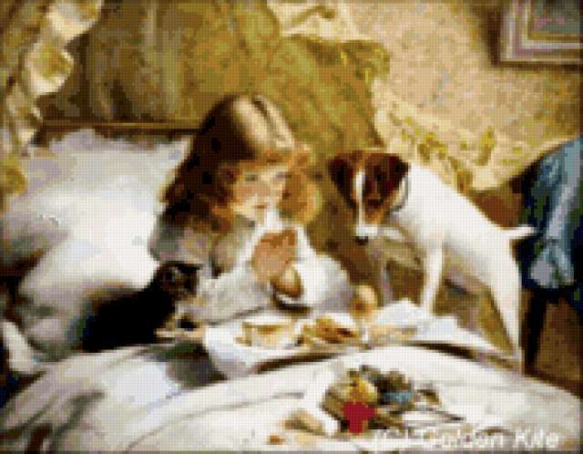 Ориентировочно так, схема вышивки «&1533», созданная автором Axlamonka, будет выглядеть при отшиве на канве. Размер данной вышивки равен 190x148 крестов, при этом используется 75 цветов. Ключевые слова, по которым можно найти эту схему: утро, молитва, завтрак, девочка, собачка, котенок, друзья. Также, вы можете взглянуть на оригинальную картинку, соответствующую данной схеме вышивки.