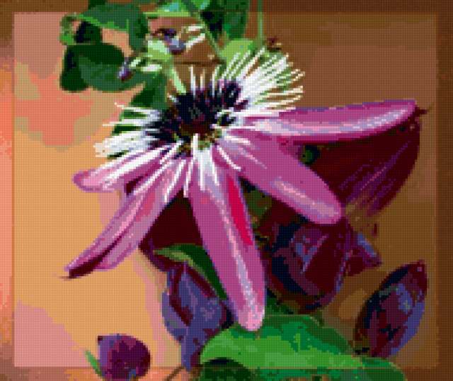Ориентировочно так, схема вышивки «&1663», созданная автором Axlamonka, будет выглядеть при отшиве на канве. Размер данной вышивки равен 190x160 крестов, при этом используется 71 цветов. Ключевые слова, по которым можно найти эту схему: цветок, клематис. подушка. Также, вы можете взглянуть на оригинальную картинку, соответствующую данной схеме вышивки.
