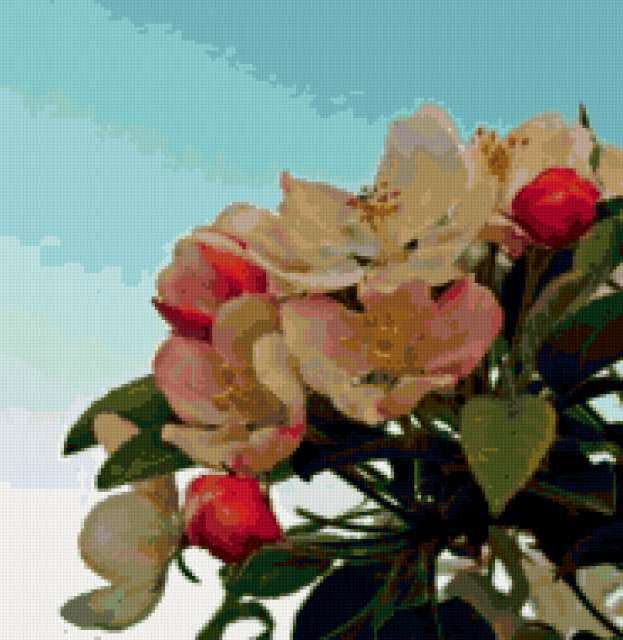 Ориентировочно так, схема вышивки «&1748», созданная автором Axlamonka, будет выглядеть при отшиве на канве. Размер данной вышивки равен 185x190 крестов, при этом используется 65 цветов. Ключевые слова, по которым можно найти эту схему: весна. яблоня, цветение. Также, вы можете взглянуть на оригинальную картинку, соответствующую данной схеме вышивки.
