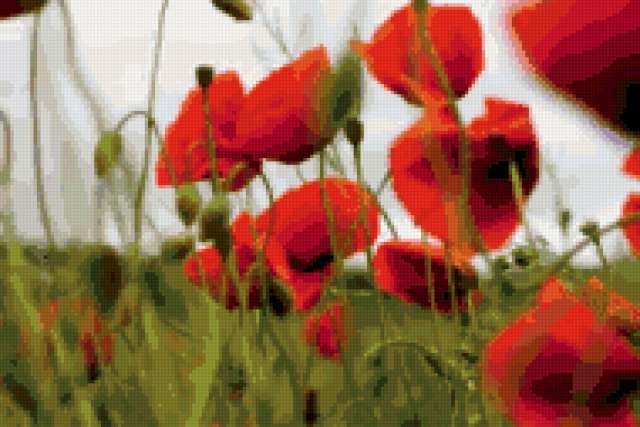 Ориентировочно так, схема вышивки «&2164», созданная автором Axlamonka, будет выглядеть при отшиве на канве. Размер данной вышивки равен 190x127 крестов, при этом используется 68 цветов. Ключевые слова, по которым можно найти эту схему: пейзаж. поле, маки. Также, вы можете взглянуть на оригинальную картинку, соответствующую данной схеме вышивки.