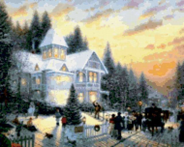 Ориентировочно так, схема вышивки «&2278», созданная автором Axlamonka, будет выглядеть при отшиве на канве. Размер данной вышивки равен 190x152 крестов, при этом используется 74 цветов. Ключевые слова, по которым можно найти эту схему: кинкейд, картина, пейзаж, праздник, особняк, рождество. Также, вы можете взглянуть на оригинальную картинку, соответствующую данной схеме вышивки.