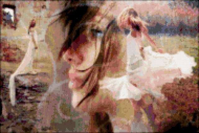Ориентировочно так, схема вышивки «&2488», созданная автором Axlamonka, будет выглядеть при отшиве на канве. Размер данной вышивки равен 190x127 крестов, при этом используется 73 цветов. Ключевые слова, по которым можно найти эту схему: девушка, весна, любовь, мечты. Также, вы можете взглянуть на оригинальную картинку, соответствующую данной схеме вышивки.