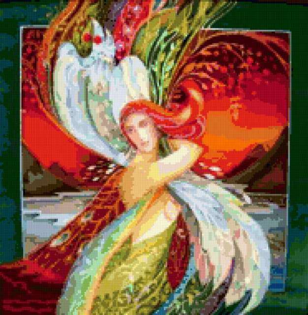Ориентировочно так, схема вышивки «&3019», созданная автором Axlamonka, будет выглядеть при отшиве на канве. Размер данной вышивки равен 186x190 крестов, при этом используется 80 цветов. Ключевые слова, по которым можно найти эту схему: девушка - времена года. Также, вы можете взглянуть на оригинальную картинку, соответствующую данной схеме вышивки.