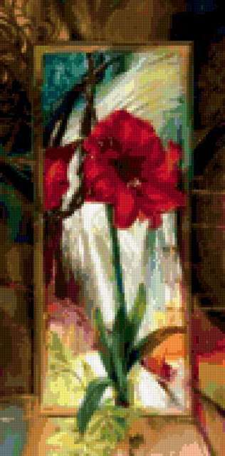 Ориентировочно так, схема вышивки «&3104», созданная автором Axlamonka, будет выглядеть при отшиве на канве. Размер данной вышивки равен 94x190 крестов, при этом используется 76 цветов. Ключевые слова, по которым можно найти эту схему: картина, панно, амариллис. Также, вы можете взглянуть на оригинальную картинку, соответствующую данной схеме вышивки.
