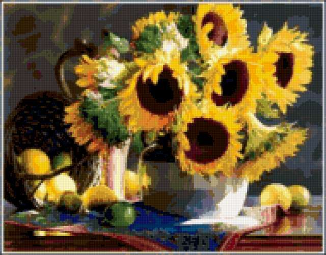 Ориентировочно так, схема вышивки «&3418», созданная автором Axlamonka, будет выглядеть при отшиве на канве. Размер данной вышивки равен 190x149 крестов, при этом используется 76 цветов. Ключевые слова, по которым можно найти эту схему: натюрморт, подсолнухи, цитрусы. Также, вы можете взглянуть на оригинальную картинку, соответствующую данной схеме вышивки.