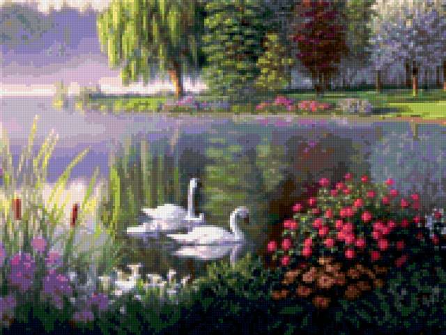 Ориентировочно так, схема вышивки «&3550», созданная автором Axlamonka, будет выглядеть при отшиве на канве. Размер данной вышивки равен 190x143 крестов, при этом используется 77 цветов. Ключевые слова, по которым можно найти эту схему: картина, пейзаж, пруд, лебеди. Также, вы можете взглянуть на оригинальную картинку, соответствующую данной схеме вышивки.