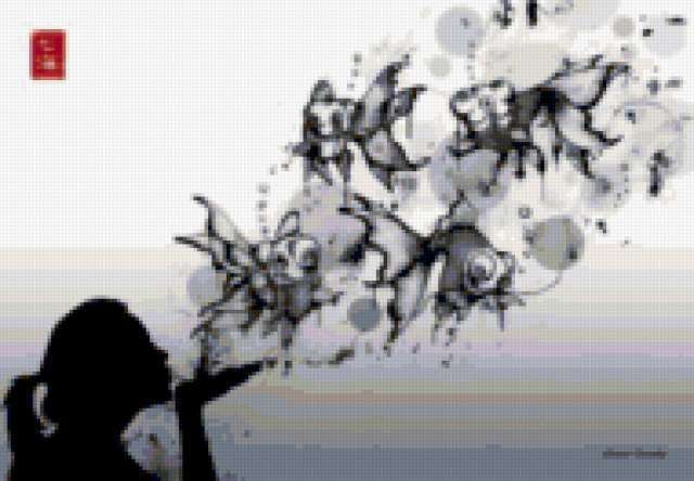 Ориентировочно так, схема вышивки «&3612», созданная автором Axlamonka, будет выглядеть при отшиве на канве. Размер данной вышивки равен 190x132 крестов, при этом используется 49 цветов. Ключевые слова, по которым можно найти эту схему: картина, графика, девочка, рыбки. Также, вы можете взглянуть на оригинальную картинку, соответствующую данной схеме вышивки.