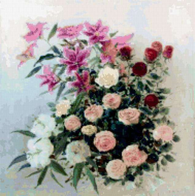 Ориентировочно так, схема вышивки «&3630», созданная автором Axlamonka, будет выглядеть при отшиве на канве. Размер данной вышивки равен 189x190 крестов, при этом используется 83 цветов. Ключевые слова, по которым можно найти эту схему: букет, цветы, розы, лилии. Также, вы можете взглянуть на оригинальную картинку, соответствующую данной схеме вышивки.