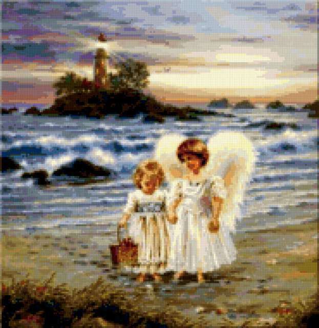 Ориентировочно так, схема вышивки «&3696», созданная автором Axlamonka, будет выглядеть при отшиве на канве. Размер данной вышивки равен 185x190 крестов, при этом используется 89 цветов. Ключевые слова, по которым можно найти эту схему: ангелочки, море, берег, остров, маяк. Также, вы можете взглянуть на оригинальную картинку, соответствующую данной схеме вышивки.