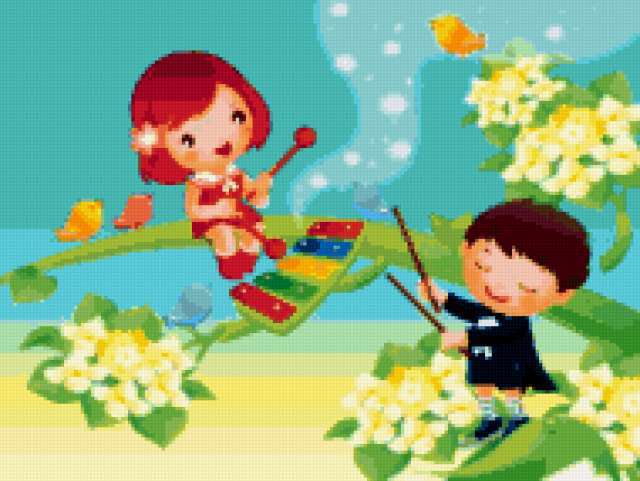 Ориентировочно так, схема вышивки «&4019», созданная автором Axlamonka, будет выглядеть при отшиве на канве. Размер данной вышивки равен 190x143 крестов, при этом используется 69 цветов. Ключевые слова, по которым можно найти эту схему: дети, музыканты, ксилофон. Также, вы можете взглянуть на оригинальную картинку, соответствующую данной схеме вышивки.