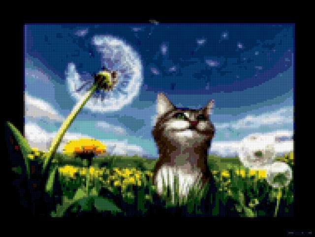 Ориентировочно так, схема вышивки «&4064», созданная автором Axlamonka, будет выглядеть при отшиве на канве. Размер данной вышивки равен 190x143 крестов, при этом используется 68 цветов. Ключевые слова, по которым можно найти эту схему: киса, поле, одуванчики. Также, вы можете взглянуть на оригинальную картинку, соответствующую данной схеме вышивки.