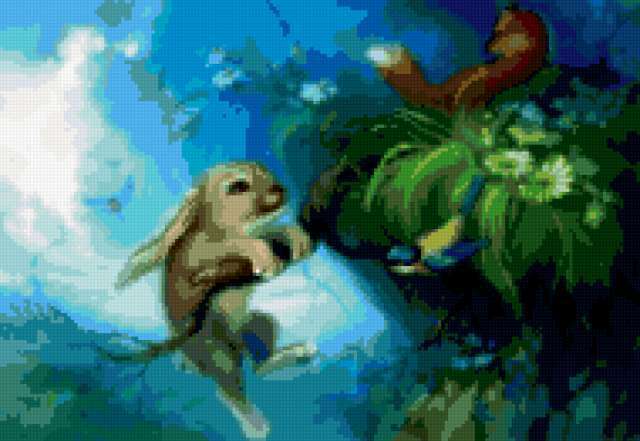 Ориентировочно так, схема вышивки «&4116», созданная автором Axlamonka, будет выглядеть при отшиве на канве. Размер данной вышивки равен 190x131 крестов, при этом используется 62 цветов. Ключевые слова, по которым можно найти эту схему: зайчик, лиса, синичка. Также, вы можете взглянуть на оригинальную картинку, соответствующую данной схеме вышивки.