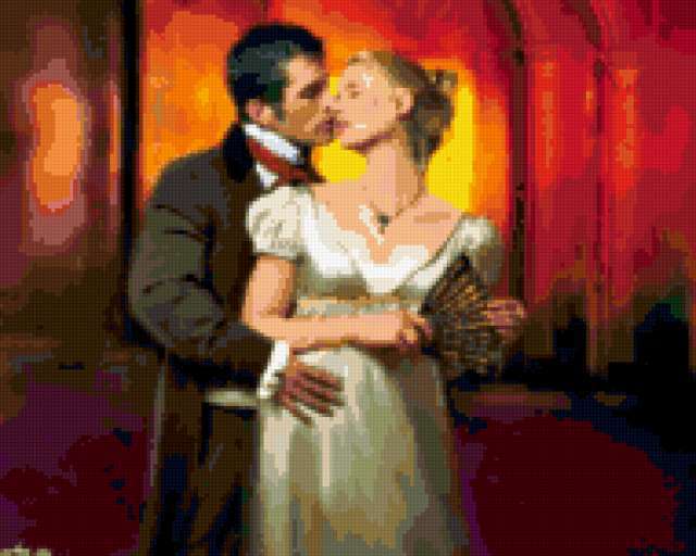 Ориентировочно так, схема вышивки «&4219», созданная автором Axlamonka, будет выглядеть при отшиве на канве. Размер данной вышивки равен 190x152 крестов, при этом используется 68 цветов. Ключевые слова, по которым можно найти эту схему: двое, любовь, нежность. Также, вы можете взглянуть на оригинальную картинку, соответствующую данной схеме вышивки.