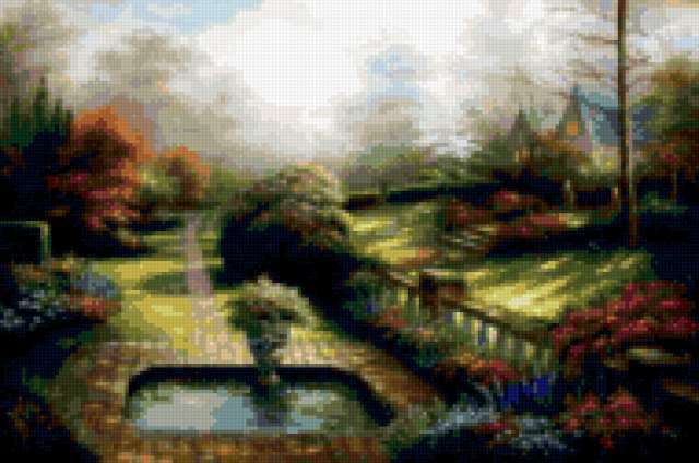 Ориентировочно так, схема вышивки «&4574», созданная автором Axlamonka, будет выглядеть при отшиве на канве. Размер данной вышивки равен 190x126 крестов, при этом используется 71 цветов. Ключевые слова, по которым можно найти эту схему: пейзаж, парк, прудик, цветы. Также, вы можете взглянуть на оригинальную картинку, соответствующую данной схеме вышивки.