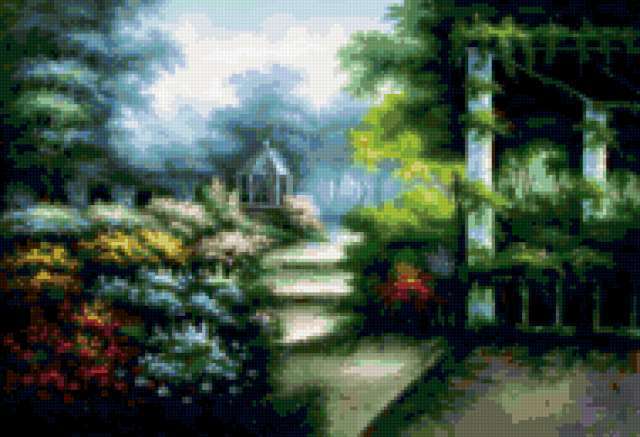 Ориентировочно так, схема вышивки «&4578», созданная автором Axlamonka, будет выглядеть при отшиве на канве. Размер данной вышивки равен 190x130 крестов, при этом используется 71 цветов. Ключевые слова, по которым можно найти эту схему: пейзаж, парк, беседки, лиана, цветы, дорожка. Также, вы можете взглянуть на оригинальную картинку, соответствующую данной схеме вышивки.