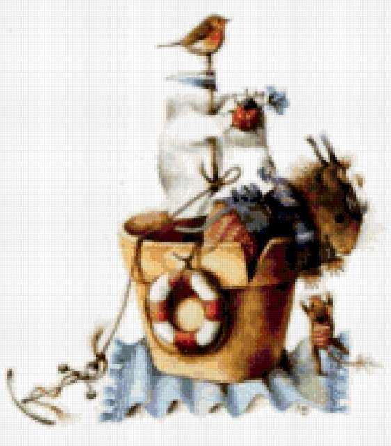 Ориентировочно так, схема вышивки «&4856», созданная автором Axlamonka, будет выглядеть при отшиве на канве. Размер данной вышивки равен 167x190 крестов, при этом используется 77 цветов. Ключевые слова, по которым можно найти эту схему: кораблик, мышонок. Также, вы можете взглянуть на оригинальную картинку, соответствующую данной схеме вышивки.