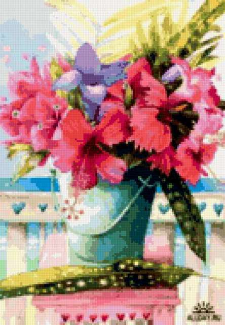 Ориентировочно так, схема вышивки «&4909», созданная автором Axlamonka, будет выглядеть при отшиве на канве. Размер данной вышивки равен 132x190 крестов, при этом используется 83 цветов. Ключевые слова, по которым можно найти эту схему: натюрморт, цветы, букет. Также, вы можете взглянуть на оригинальную картинку, соответствующую данной схеме вышивки.