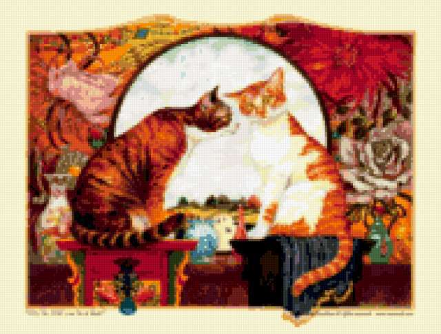 Ориентировочно так, схема вышивки «&4932», созданная автором Axlamonka, будет выглядеть при отшиве на канве. Размер данной вышивки равен 190x144 крестов, при этом используется 72 цветов. Ключевые слова, по которым можно найти эту схему: киски, объяснение. Также, вы можете взглянуть на оригинальную картинку, соответствующую данной схеме вышивки.