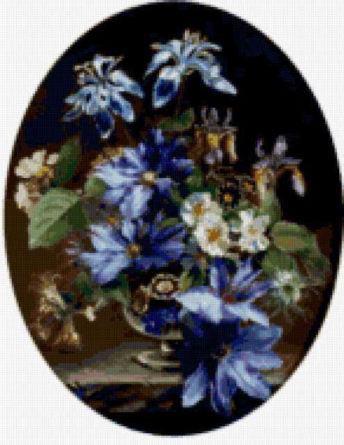 Ориентировочно так, схема вышивки «&5036», созданная автором Axlamonka, будет выглядеть при отшиве на канве. Размер данной вышивки равен 147x190 крестов, при этом используется 69 цветов. Ключевые слова, по которым можно найти эту схему: цветы, букет, натюрморт, ирисы, клематис. Также, вы можете взглянуть на оригинальную картинку, соответствующую данной схеме вышивки.