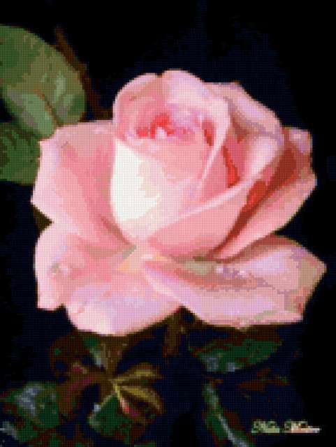 Ориентировочно так, схема вышивки «&5044», созданная автором Axlamonka, будет выглядеть при отшиве на канве. Размер данной вышивки равен 143x190 крестов, при этом используется 65 цветов. Ключевые слова, по которым можно найти эту схему: цветок, роза, скромность. Также, вы можете взглянуть на оригинальную картинку, соответствующую данной схеме вышивки.