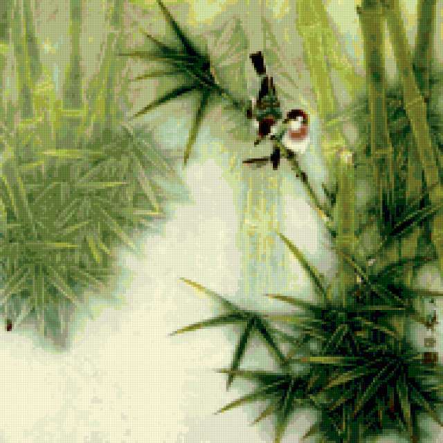 Ориентировочно так, схема вышивки «&5075», созданная автором Axlamonka, будет выглядеть при отшиве на канве. Размер данной вышивки равен 190x190 крестов, при этом используется 52 цветов. Ключевые слова, по которым можно найти эту схему: бамбук, птички, подушка. Также, вы можете взглянуть на оригинальную картинку, соответствующую данной схеме вышивки.