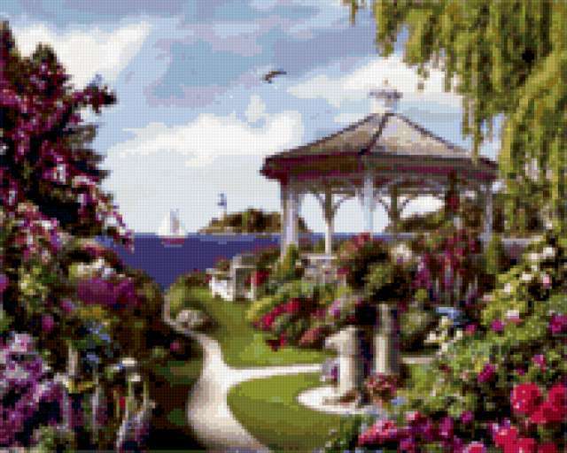 Ориентировочно так, схема вышивки «&5103», созданная автором Axlamonka, будет выглядеть при отшиве на канве. Размер данной вышивки равен 190x152 крестов, при этом используется 78 цветов. Ключевые слова, по которым можно найти эту схему: пейзаж, лето, море, парк, беседка, цветы. Также, вы можете взглянуть на оригинальную картинку, соответствующую данной схеме вышивки.