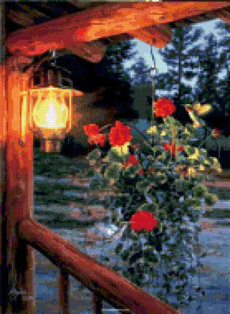 Ориентировочно так, схема вышивки «&5128», созданная автором Axlamonka, будет выглядеть при отшиве на канве. Размер данной вышивки равен 139x190 крестов, при этом используется 77 цветов. Ключевые слова, по которым можно найти эту схему: пейзаж, крыльцо, фонарик, цветы, петуния, вечер. Также, вы можете взглянуть на оригинальную картинку, соответствующую данной схеме вышивки.