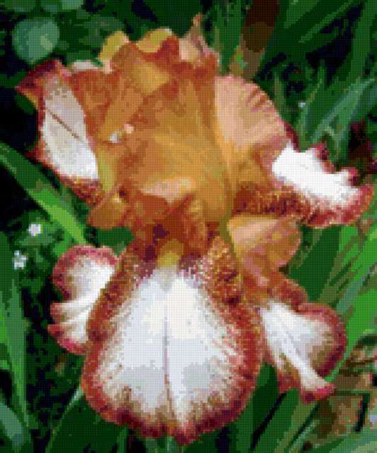 Ориентировочно так, схема вышивки «&5196», созданная автором Axlamonka, будет выглядеть при отшиве на канве. Размер данной вышивки равен 158x190 крестов, при этом используется 75 цветов. Ключевые слова, по которым можно найти эту схему: цветок, ирис. Также, вы можете взглянуть на оригинальную картинку, соответствующую данной схеме вышивки.