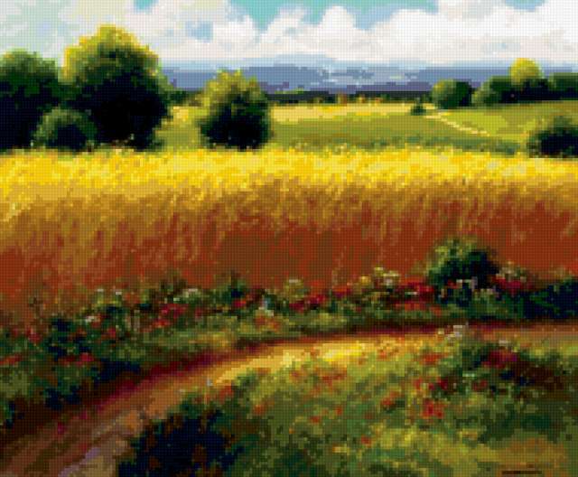 Ориентировочно так, схема вышивки «&5542», созданная автором Axlamonka, будет выглядеть при отшиве на канве. Размер данной вышивки равен 190x157 крестов, при этом используется 72 цветов. Ключевые слова, по которым можно найти эту схему: пейзаж, поле, дорожка, цветы. Также, вы можете взглянуть на оригинальную картинку, соответствующую данной схеме вышивки.