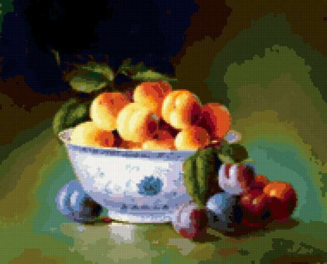 Ориентировочно так, схема вышивки «&5591», созданная автором Axlamonka, будет выглядеть при отшиве на канве. Размер данной вышивки равен 190x154 крестов, при этом используется 68 цветов. Ключевые слова, по которым можно найти эту схему: натюрморт, сливы. Также, вы можете взглянуть на оригинальную картинку, соответствующую данной схеме вышивки.