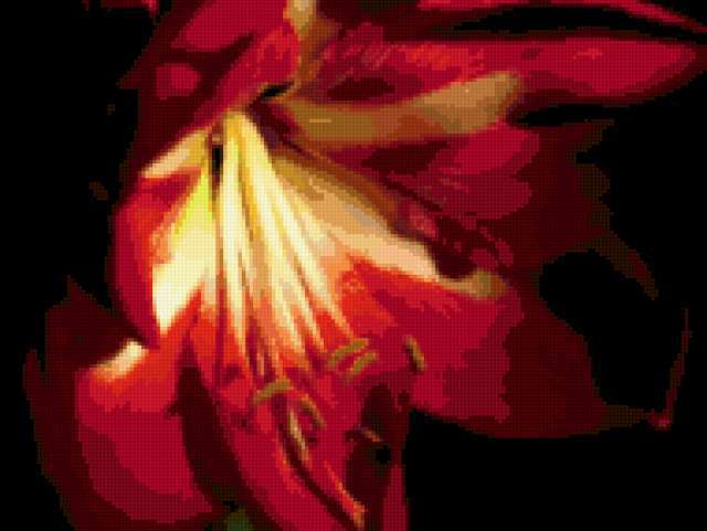 Ориентировочно так, схема вышивки «&571», созданная автором Axlamonka, будет выглядеть при отшиве на канве. Размер данной вышивки равен 190x143 крестов, при этом используется 51 цветов. Ключевые слова, по которым можно найти эту схему: цветок, амариллис. Также, вы можете взглянуть на оригинальную картинку, соответствующую данной схеме вышивки.