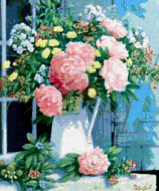 Ориентировочно так, схема вышивки «&5898», созданная автором Axlamonka, будет выглядеть при отшиве на канве. Размер данной вышивки равен 158x190 крестов, при этом используется 82 цветов. Ключевые слова, по которым можно найти эту схему: цветы, натюрморт, пионы. Также, вы можете взглянуть на оригинальную картинку, соответствующую данной схеме вышивки.