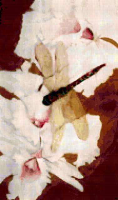 Ориентировочно так, схема вышивки «&5971», созданная автором Axlamonka, будет выглядеть при отшиве на канве. Размер данной вышивки равен 112x190 крестов, при этом используется 67 цветов. Ключевые слова, по которым можно найти эту схему: цветы, орхидеи, стрекоза. Также, вы можете взглянуть на оригинальную картинку, соответствующую данной схеме вышивки.