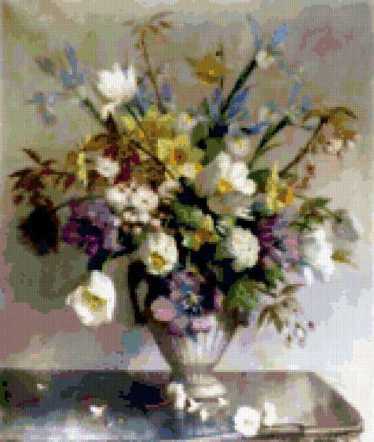 Ориентировочно так, схема вышивки «&5993», созданная автором Axlamonka, будет выглядеть при отшиве на канве. Размер данной вышивки равен 161x190 крестов, при этом используется 81 цветов. Ключевые слова, по которым можно найти эту схему: цветы, букет, натюрморт. Также, вы можете взглянуть на оригинальную картинку, соответствующую данной схеме вышивки.