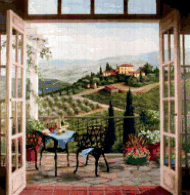 Ориентировочно так, схема вышивки «&6012», созданная автором Axlamonka, будет выглядеть при отшиве на канве. Размер данной вышивки равен 186x190 крестов, при этом используется 83 цветов. Ключевые слова, по которым можно найти эту схему: пейзаж, окно, кипарисы, поля, Италия, подушка. Также, вы можете взглянуть на оригинальную картинку, соответствующую данной схеме вышивки.