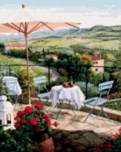 Ориентировочно так, схема вышивки «&6017», созданная автором Axlamonka, будет выглядеть при отшиве на канве. Размер данной вышивки равен 152x190 крестов, при этом используется 83 цветов. Ключевые слова, по которым можно найти эту схему: пейзаж, веранда, цветы, зонтик. Также, вы можете взглянуть на оригинальную картинку, соответствующую данной схеме вышивки.