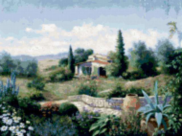 Ориентировочно так, схема вышивки «&6020», созданная автором Axlamonka, будет выглядеть при отшиве на канве. Размер данной вышивки равен 190x142 крестов, при этом используется 75 цветов. Ключевые слова, по которым можно найти эту схему: пейзаж, лето, цветы, домик. Также, вы можете взглянуть на оригинальную картинку, соответствующую данной схеме вышивки.