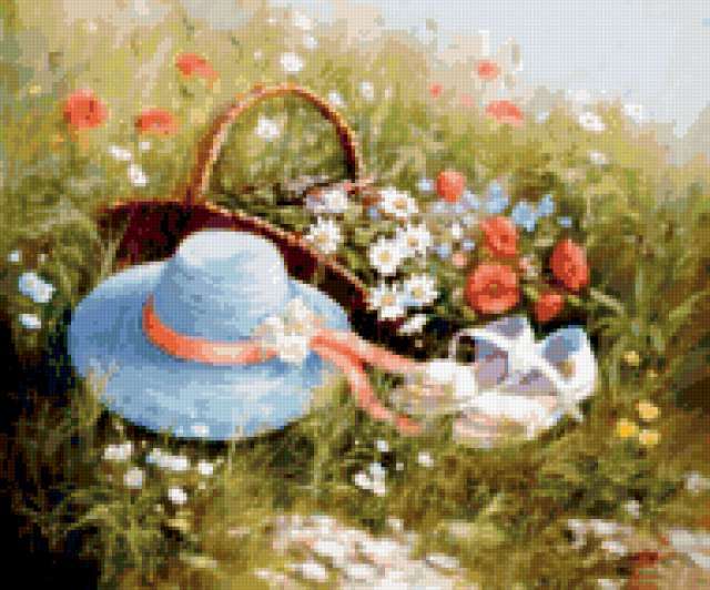 Ориентировочно так, схема вышивки «&6070», созданная автором Axlamonka, будет выглядеть при отшиве на канве. Размер данной вышивки равен 190x158 крестов, при этом используется 82 цветов. Ключевые слова, по которым можно найти эту схему: пейзаж, поле, цветы, корзинка, шляпка. Также, вы можете взглянуть на оригинальную картинку, соответствующую данной схеме вышивки.