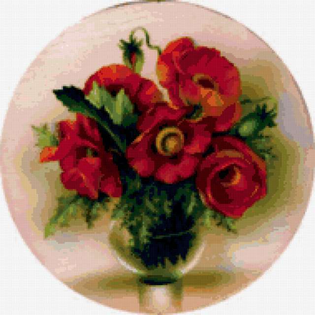 Ориентировочно так, схема вышивки «&6084», созданная автором Axlamonka, будет выглядеть при отшиве на канве. Размер данной вышивки равен 190x190 крестов, при этом используется 66 цветов. Ключевые слова, по которым можно найти эту схему: цветы, маки, подушка. Также, вы можете взглянуть на оригинальную картинку, соответствующую данной схеме вышивки.