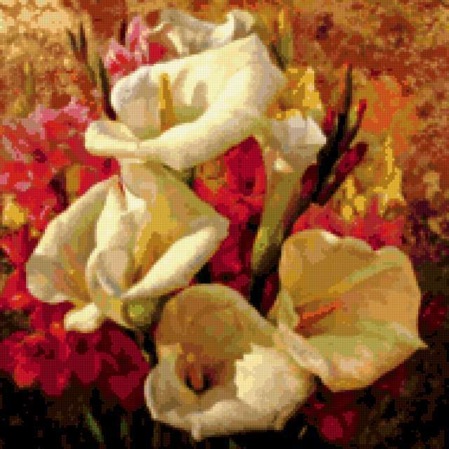 Ориентировочно так, схема вышивки «&6108», созданная автором Axlamonka, будет выглядеть при отшиве на канве. Размер данной вышивки равен 190x190 крестов, при этом используется 73 цветов. Ключевые слова, по которым можно найти эту схему: цветы, букет, каллы, подушка. Также, вы можете взглянуть на оригинальную картинку, соответствующую данной схеме вышивки.