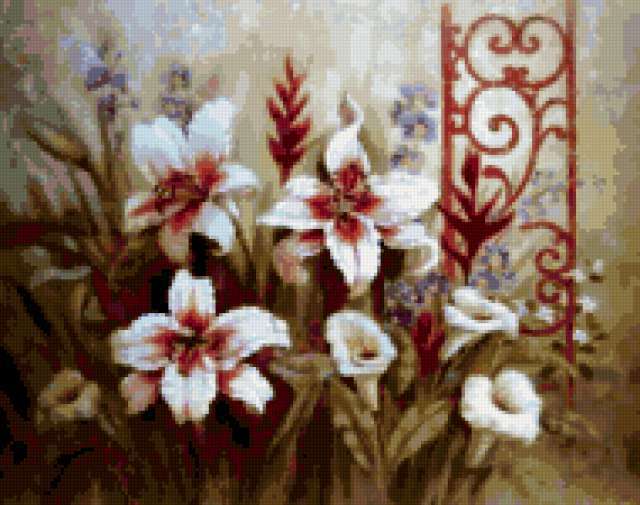 Ориентировочно так, схема вышивки «&6109», созданная автором Axlamonka, будет выглядеть при отшиве на канве. Размер данной вышивки равен 190x150 крестов, при этом используется 77 цветов. Ключевые слова, по которым можно найти эту схему: цветы. Также, вы можете взглянуть на оригинальную картинку, соответствующую данной схеме вышивки.