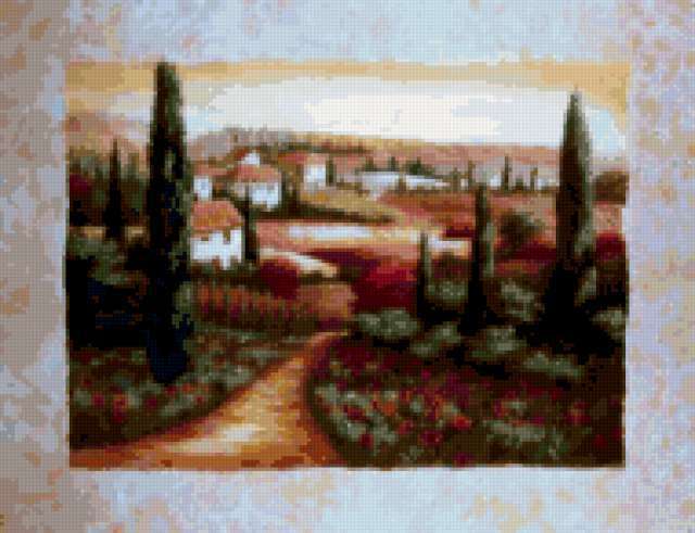 Ориентировочно так, схема вышивки «&6115», созданная автором Axlamonka, будет выглядеть при отшиве на канве. Размер данной вышивки равен 190x146 крестов, при этом используется 72 цветов. Ключевые слова, по которым можно найти эту схему: пейзаж, деревушка, поля, кипарисы. Также, вы можете взглянуть на оригинальную картинку, соответствующую данной схеме вышивки.