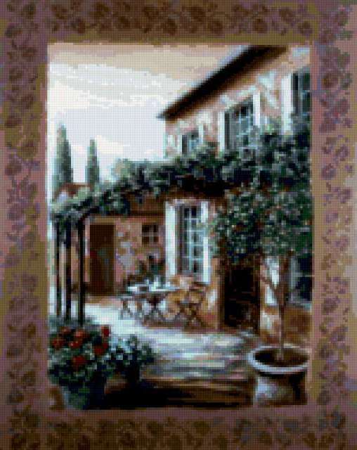 Ориентировочно так, схема вышивки «&6117», созданная автором Axlamonka, будет выглядеть при отшиве на канве. Размер данной вышивки равен 151x190 крестов, при этом используется 68 цветов. Ключевые слова, по которым можно найти эту схему: картина, пейзаж, домик, дворик, зелень. Также, вы можете взглянуть на оригинальную картинку, соответствующую данной схеме вышивки.